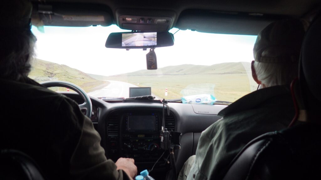 2019年、ブルハントに向かっているところ。助手席にバルスボルド博士、運転手は博士の息子のリグデンさん。この親子、なんだかとてもよくしゃべっていました。父と息子でこんなにしゃべるんだー、仲いいなぁ。