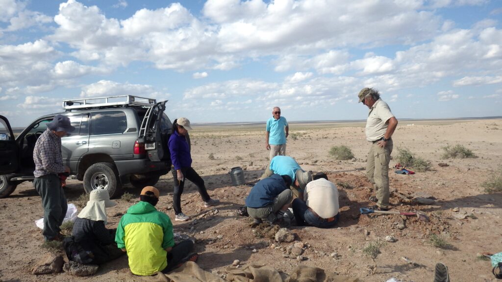 写真の、立っている水色シャツ姿がバルスボルド博士。掘り出そうとする化石をみんなで囲んでいるところです。